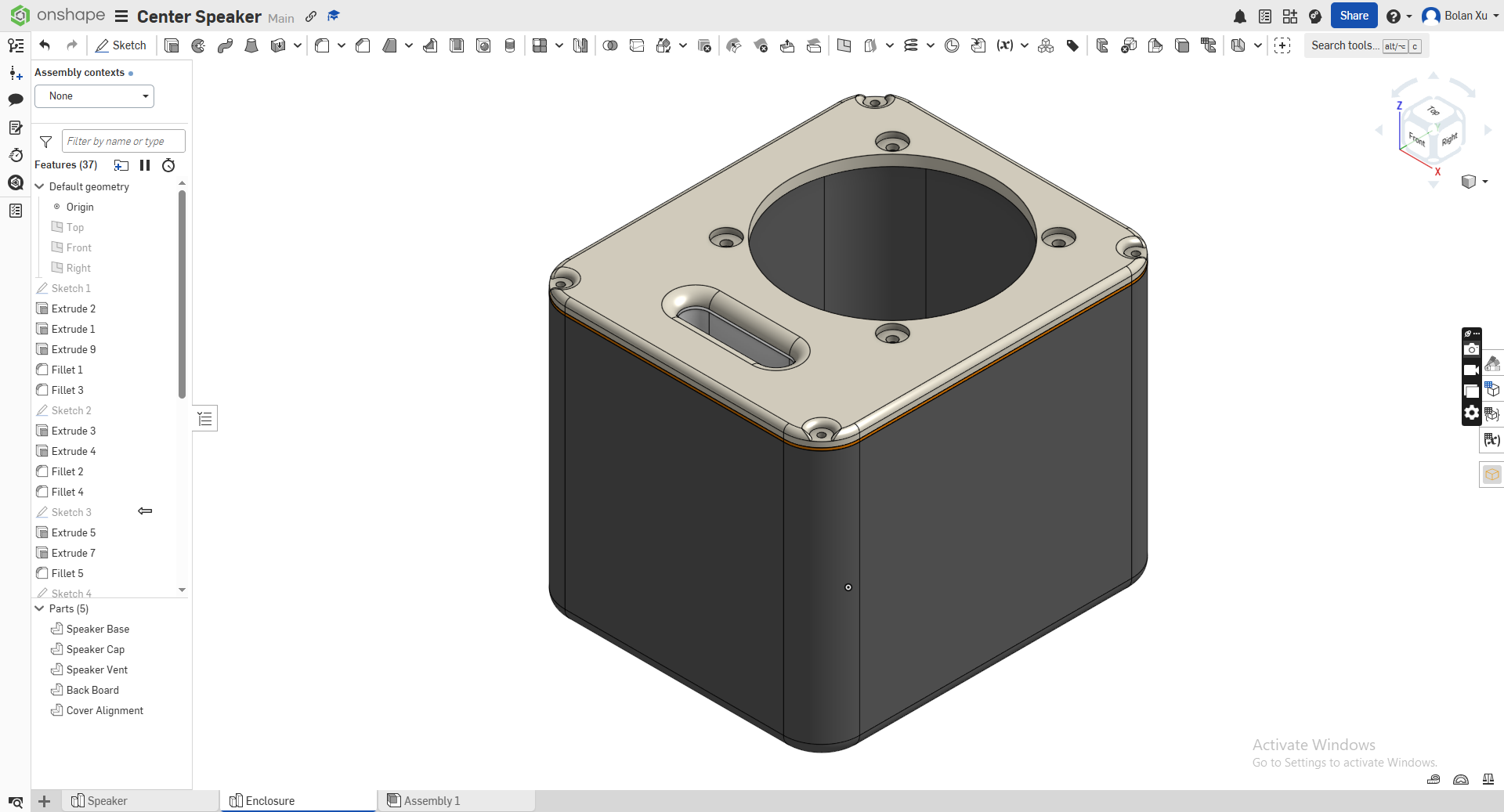 I used Onshape to create the enclosure and here’s the link to the rep with the stl files: https://github.com/bolanxu/Custom-3D-Printed-Speaker
